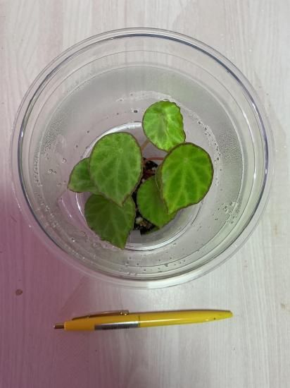 切れ込みの無い、ペルテートの葉が特徴、花は株の根元で開花します。2号苗